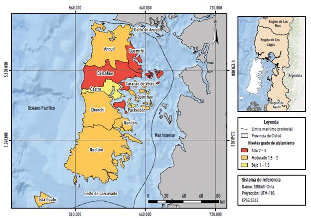 El resultado del grado de aislamiento obtenido en el área provincial clasifica, por un lado, las comunas de Puqueldón, Curaco de Vélez, Dalcahue y Quemchi con un alto grado de aislamiento, mientras que, por otro lado, las comunas de Quellón, Chonchi, Ancud, Queilén y Quinchao se clasifican con un grado de aislamiento medio. El único territorio comunal que se consideró con un grado de aislamiento bajo corresponde a la comuna de Castro, la cual es también la capital de la provincia y concentra la mayoría de los servicios del área provincial.