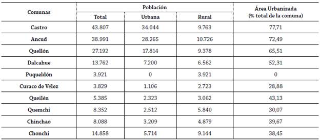 Tabla 1: Datos de población (urbano-rural) y porcentaje de área urbanizada en las comunas de la Provincia de Chiloé, Chile
