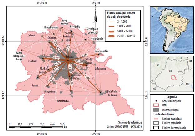 A Figura 5 mostra que os maiores fluxos existem entre Goiânia e os municípios com maior população; com maior destaque económico da RMG (concentração de empregos); e cuja mancha urbana mostra o processo de conurbação, que são Aparecida de Goiânia, Trindade e Senador Canedo, com cerca de 124.000, 21.000 e 25.000 pessoas respectivamente deslocando-se regularmente entre estes municípios e a Capital. Tais números revelam a marcada relação centro-periferia, a concentração na cidade núcleo, assim como uma grande relação de dependência e complementaridade entre os municípios.