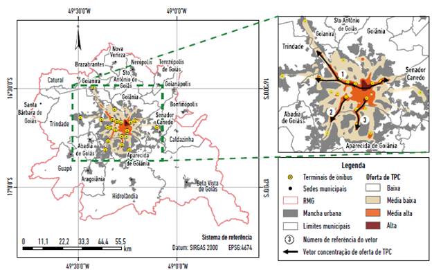 A partir da Figura 6 observa-se, com relação à rede de transporte coletivo, que: i) atende à maior parte da mancha urbana, englobando 18 municípios da rede, apesar de uma ocupação urbana fragmentada, de baixa densidade e de longas distâncias, a exemplo dos municípios de Guapó, Aragoiânia, Hidrolândia e Bela Vista ao sul; Caldazinha a sudeste; Brazabrantes, Nova Veneza, Santo Antônio de Goiás, Nerópolis, Terezópolis de Goiás, Goianápolis e Bonfinópolis a norte e nordeste; ii) alta oferta concentrada na região central de Goiânia, principalmente a partir do Eixo Anhanguera, que se ramifica, a partir da estrutura viária intramunicipal, em direção à Trindade, Goianira e Senador Canedo (Vetor 1); e dois outros vetores (2 e 3) em direção ao sul, chegando à Aparecida de Goiânia, a segunda maior cidade da RMG.