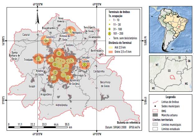 No contexto da intermodalidade, a bicicleta se apresenta com grande potencial de integração com o transporte coletivo. A RMG já contém uma infraestrutura inicial capaz de potencializar esta intermodalidade. Dos 21 terminais de transporte coletivo existentes, 16 já contam com bicicletários (Figura 6), sendo que a taxa de ocupação (média diária de bicicletas registradas no bicicletário do terminal) chega a 250 bicicletas no terminal de Senador Canedo. Com relação aos raios de 2,5 e 5 km, a Figura 7 mostra que grande parte da mancha urbana, principalmente nos municípios de pequeno porte, está contida nesses raios. Ou seja, grande parte da mancha urbana da RMG está acessível por bicicleta a partir dos terminais, em um percurso de até 20 minutos.