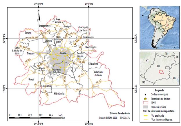 Em 2014, a RMG iniciou a elaboração do seu plano de desenvolvimento integrado. Depois de paralisado o processo, em 2017 o mesmo foi retomado e produzido um documento técnico, denominado Diagnóstico da RMG, sendo mobilidade urbana um dos eixos analisados (UFG e SECIMA 2017). Na sequência, a RMG teve sua estrutura alterada pela Lei Complementar 139/2018 (Governo do Estado de Goiás 2018) constituindo-se, a partir de então, por 20 municípios.