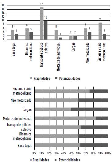 Figura 9: Síntese quantitativa das fragilidades e potencialidades da mobilidade na RMG, por subtema, identificadas com a aplicação do método desenvolvido.