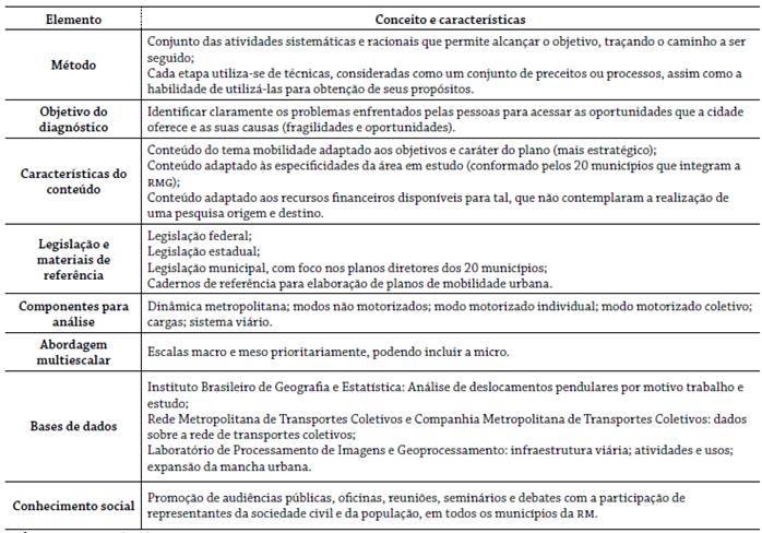 A partir das referências citadas anteriormente, que procuram resumir os elementos e características considerados na elaboração do método para diagnóstico da mobilidade para o PDI_RMG, apresenta-se a Tabela 1, que procura sistematizar tais itens.
