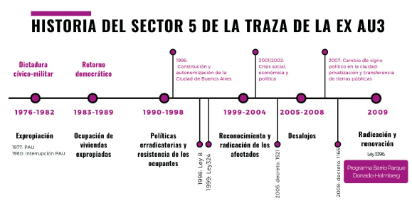La década de los noventa marcó el desembarco de políticas de tinte neoliberal, que se expresaron sobre la traza, con una fuerte política erradicatoria vía desalojos de los hogares ocupantes para liberar la zona y facilitar un posterior proceso de renovación urbana. Sin embargo, estas intervenciones fueron resistidas por las familias ocupantes, quienes, lentamente, consolidaron un entramado de actores sociales de base territorial que en 1999 logró la sanción la Ley n.° 324/99. Esta normativa incluía tres líneas de acción orientadas a la "recuperación de la traza", a la vez que daba origen a un nuevo organismo -la Unidad Ejecutora de la EXAU3- a cargo de la gestión de estas medidas. Entre estas las líneas de acción, el PH apuntaba al reconocimiento y radicación de los afectados, y ofrecía distintas alternativas de acceso a la vivienda para las familias ocupantes (Bascuas y Provenzano 2013; Fernández y Zucco 2013; Quiroga y Pérez 2015 Zapata 2017).4