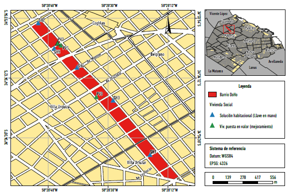 El trabajo se apoya en una estrategia metodológica cualitativa que recupera datos provenientes de fuentes secundarias (informes de gestión del organismo ejecutor de la política y de organismos controladores, bibliografía académica, etc.) y primarias. Entre estas últimas, se analizan entrevistas semiestructuradas realizadas entre el 2016 y el 2018 a informantes clave y a residentes de las viviendas sociales construidas sobre la traza bajo el objetivo de radicación.2 El análisis se complementa, además, con observaciones no participantes en el barrio y la realización de un mapeo colectivo para identificar las transformaciones territoriales sobre las 14 manzanas del Barrio Donado Holmberg entre julio de 2016 y mayo de 2018. Las entrevistas fueron procesadas mediante la utilización de un software para el análisis de datos cualitativos, las observaciones fueron registradas mediante notas de campo y relevamiento fotográfico, y la georreferenciación de los datos construida con el mapeo colectivo se procesó mediante la utilización del programa QGIS. El análisis de los datos fue temático, a partir de la definición de dimensiones de análisis desprendidas de los objetivos planteados en la investigación.