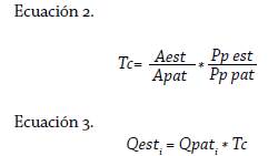 Se estimaron los caudales medios de las subcuencas a través del método de Transposición de Caudales, también conocido como método del Coeficiente de Transferencia (TAHAL Consulting Engineers LTD. 1998). Este método permite relacionar un caudal patrón registrado y medido en un punto de una cuenca con la precipitación promedio y extensión territorial de sus subdivisiones hidrográficas, para obtener el caudal promedio de cada una de ellas (Naranjo y Duque 2004). Se tomó como patrón el caudal promedio mensual medido en la estación hidrométrica Paso Viboral para el periodo 1962-1992, y, haciendo uso de las ecuaciones 2 y 3, se obtuvieron los caudales de cada subcuenca: Ecuación 2.