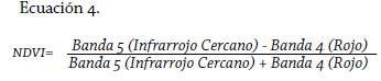 El análisis de la cobertura y uso del terreno fue derivado a partir de la interpretación de una imagen Landsat 8: LC80050532016018LGN00 de 30 m de resolución, tomada el 18 de enero de 2016. Las categorías fueron identificadas a partir del índice diferencial de vegetación normalizada -en adelante, NDVI-, indicador que mide la relación entre la energía absorbida y emitida por los objetos terrestres; el índice arroja valores de intensidad del verdor de la vegetación, así como de las zonas no vegetadas, permitiendo determinar el estado de vigor de la vegetación presente en la superficie (Chuvieco 2010). El NDVI es un índice adimensional y por lo tanto sus valores van de +1 a -1; se calcula a través de la Ecuación 4: