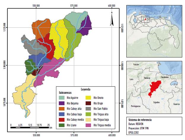 El río Tirgua nace en las estribaciones del tramo occidental del sistema de la Costa, en la región centroccidental de Venezuela y se ubica entre las coordenadas 587.776 y 534.677 m. N, y 106.4976 y 113.4913 m. E. Abarca parte de los estados Carabobo, Cojedes y Yaracuy, y ocupa una superficie aproximada de 1497,3 km2 (Figura 2).