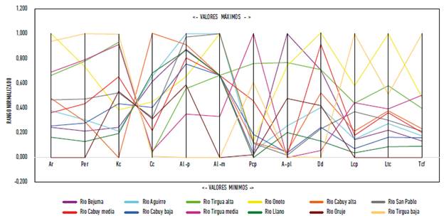 La Figura 3 muestra el set de descriptores geomorfométricos representados en un gráfico de coordenadas paralelas, en el que cada subcuenca se identifica cromáticamente con el color especificado en la Tabla 3. Es importante destacar que, debido a su homogeneidad intrínseca resultante, el descriptor permeabilidad litológica (Perm-lit) fue excluido de la evaluación estadística; no obstante, fue considerado para complementar la discusión de los resultados.