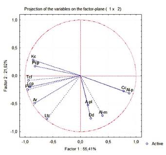 La Figura 4 muestra el circulo de correlaciones de los descriptores geomorfométricos, combinando los CP1 y CP2. Estos dos componentes muestran en los cuadrantes II, III y IV las diferentes correlaciones entre los descriptores geomorfométricos; se pudieron observar, en primer lugar, correlaciones simples positivas y negativas estadísticamente significativas entre varios de los descriptores, mostrando a su vez contribuciones importantes en la explicación de la variabilidad. En segundo lugar, aparecen descriptores como Pcp, A-pl, Dd, Al-m y Cc que, aun cuando su contribución no es importante, se encuentran altamente correlacionados de forma positiva con otros; tal es el caso de Al-p con respecto a Cc y de A-pl con Dd. Otras correlaciones positivas importantes se observan entre Kc con Pcp, Lcp con Per y Tcf con Lcp. Correlaciones inversas o negativas estadísticamente significativas las muestran los descriptores Cc y Al-p con Kc y Pcp.