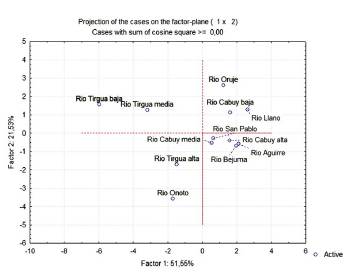 La Figura 5 muestra la proyección de los casos (subcuencas) en el plano cartesiano, y la correspondiente nube de individuos. En el primer cuadrante aparecen las subcuencas: Oruje, Llano y Cabuy baja. La inexistencia de descriptores en este cuadrante del círculo de correlaciones indica que la conformación de este grupo de subcuencas no es explicada por ninguno de los descriptores evaluados, y que su similitud podría ser determinada estadísticamente por el 22,98 % restante de la varianza que no logra ser explicada por los tres componentes seleccionados. Estas tres subcuencas aparecen dispuestas en forma contigua en el sector medio de la cuenca, con tamaños, formas y geometría variables entre sí, por lo que ninguno de los descriptores evaluados logra definir un nivel de similitud de forma efectiva entre estas subcuencas.