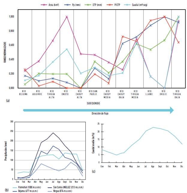 La Tabla 6 muestra los valores estimados de: precipitación media anual, ETP media anual, índice de humedad (I-hum), y caudal medio anual, para cada una de las subcuencas. Estos valores fueron normalizados para ser más fácilmente visualizados y comparados en la Figura 6a, junto con la dinámica temporal de las precipitaciones en cuatro estaciones climatológicas dentro de la cuenca (Figura 6b); la Figura 6c, por su parte, muestra la dinámica temporal de los caudales del río Tirgua en la estación Paso Viboral, al cierre de la cuenca. Las tendencias reflejadas en la Figura 6(a) permiten diferenciar la cuenca del río Tirgua en tres grandes zonas.