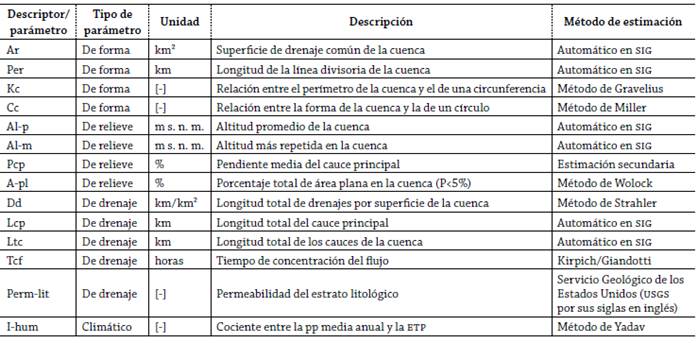 Se consideraron para la caracterización hidrogeográfica tres tipos de descriptores: (1) de forma, (2) de relieve y (3) de drenaje. Estos resultan de vital importancia para determinar las relaciones que las condiciones morfológicas, geológicas, climáticas e hidrológicas tienen, y que permiten inferir en conjunto el comportamiento hidrológico intrínseco de cada subcuenca (Viramontes et ál. 2007; Yadav, Wagener y Gupta 2007; Sawicz et ál. 2011). De acuerdo con el enfoque de paisajes hidrológicos seguido en el trabajo, fueron agregados tres parámetros de particular relevancia que permiten ilustrar con cierta precisión la dinámica hidrológica en función del paisaje (Wolock, Winter y McMahon 2004): la proporción de áreas planas en cada subcuenca, la permeabilidad litológica y el índice de humedad. Se sintetizaron las características geomorfométricas derivadas en esta fase metodológica (véase tabla 2).