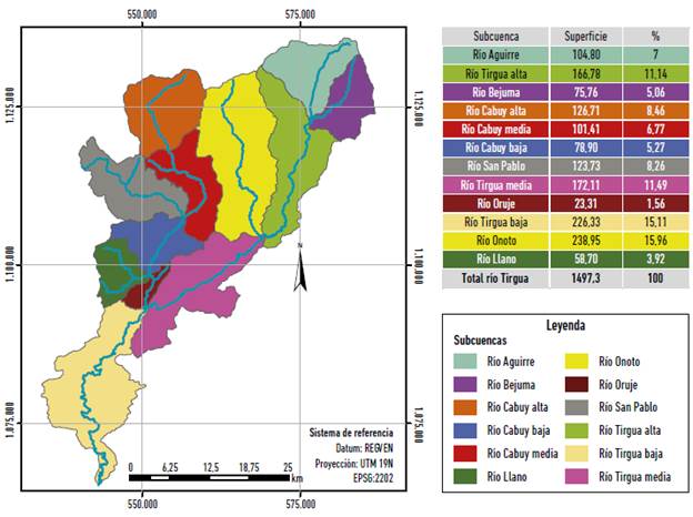 El río Tirgua nace en la Serranía del Interior con el nombre de río Aguirre y su longitud es de 127 km hasta el punto de cierre en el puente sobre la autopista José Antonio Páez (troncal 5) al suroeste de la ciudad de San Carlos. Tal como se observa en la figura adjunta a la Tabla 3, la cuenca tiene una forma alargada y una asimetría absoluta, ya que su área de captación y su red de drenaje se encuentran completamente en su vertiente derecha. Está conformada por 12 subcuencas de superficie y geometría variables, siendo Onoto la subcuenca de mayor tamaño, mientras que Oruje tiene la menor superficie (Tabla 3).
