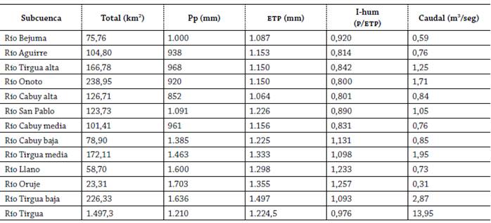 Tabla 6: Parámetros hidroclimáticos de las subcuencas que conforman la cuenca del río Tirgua