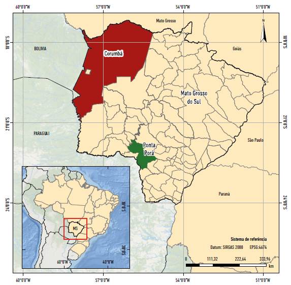 Realizou-se uma pesquisa avaliativa com a utilização de estudos comparativos entre dois municípios fronteiriços do estado de Mato Grosso do Sul, na Região Centro-Oeste do Brasil, na porção Centro-Leste da América do Sul. Na seleção dos municípios foram considerados os seguintes critérios: possuir território em contato direto com o limite internacional e ser considerado município prioritário para o PNCD em Mato Grosso do Sul. Assim, foram identificados dois municípios: Corumbá e Ponta Porã (Figura 1).