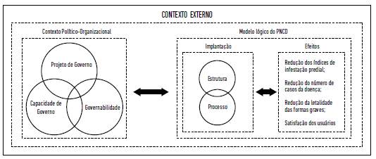 Este estudo é uma das etapas da pesquisa "Avaliação da Implantação do PNCD em Municípios Fronteiriços de Mato Grosso do Sul". A primeira etapa correspondeu a um estudo de verificação, definido como um conjunto de procedimentos que antecedem a realização da avaliação propriamente dita (Leviton et al. 2010). Este exercício permitiu a construção do modelo lógico do programa, do modelo teórico da avaliação e da elaboração e validação, através de técnica de consenso entre especialistas, da matriz de critérios para avaliar o programa (Costa e Cunha 2017). O modelo teórico da avaliação proposto (Figura 2) contempla os contextos externo, político-organizacional, a implantação propriamente dita e os efeitos.
