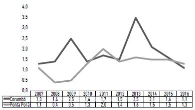 Figura 3: Índice de infestação predial. Corumbá, Ponta Porã/MS, 2007 a 2016.