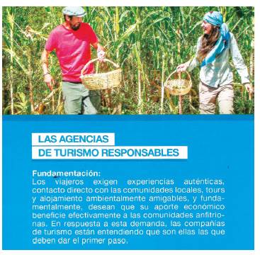 Con frecuencia en las imágenes también es posible ver retratado al local como anfitrión dedicado a la atención de sus huéspedes turistas (lo que da forma a la idea de hospitalidad necesaria para el desarrollo de todo negocio turístico). Esto se plasma en la forma en que ellos son presentados: sonrientes, abiertos a mostrar su trabajo, su hogar, su forma de vida. Mirando a la cámara se crea una especie de intimidad entre el potencial observador y la persona observada, esta última exhibe una predisposición a dar la bienvenida al turista (Nelson 2005) (Figura 14).