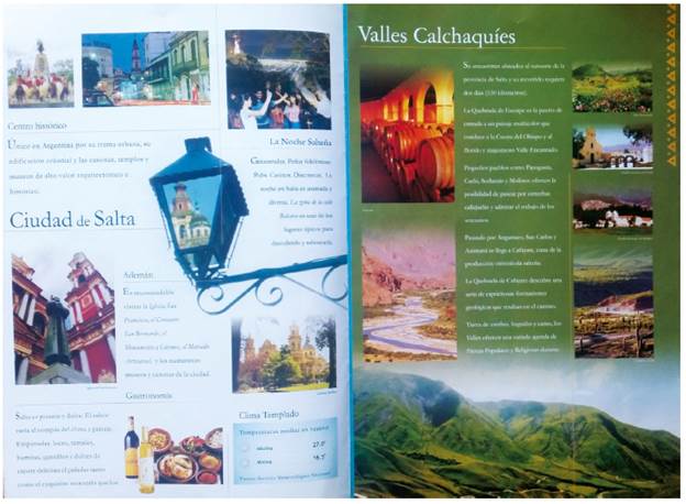 Este diseño dio paso a la predominancia de imágenes que adquirieron mayor tamaño, restándole espacio al texto en las páginas en que ambos aparecen combinados. El texto se achica y las imágenes se agrandan; las imágenes saturan todo el espacio de los folletos. En efecto, en ocasiones, el texto solo queda reducido a un pequeño epígrafe o un título con alguna información básica acerca de lo presentado en la foto (véase figura 2). Este tipo de estrategias gráficas tiene su correlato en materiales audiovisuales; en efecto, existen varias piezas en las que la sucesión de imágenes acerca de las posibilidades turísticas de la provincia no están acompañadas de la tradicional voz en off que suele describir o presentar atractivos y destinos, sino solamente por música o sonido ambiental de los lugares retratados por la cámara -véase por ejemplo el video promocional "Salta, tan linda que enamora" de 2012 (Visit Salta 2012)-.