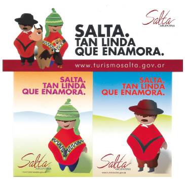 Las imágenes que presentan a los habitantes de los destinos turísticos responden en cierta medida a tendencias ya ampliamente señaladas, respecto de la forma de retratar turísticamente a la población local recurriendo a estereotipos locales, regionales, étnicos, etc. La utilización de imágenes de la población local en versiones estereotipadas y pintorescas queda confirmada a partir de la creación de ilustraciones de "personajes locales"11 presentes en el merchandising oficial (remeras, tazas, cuadernos, señaladores, etc.) (Figura 12). El "gaucho" y el "coya" se transforman en los tipos provinciales asumidos como característicos por el marketing provincial (y reconocidos, a nivel nacional, como los habitantes "típicos" del noroeste argentino).