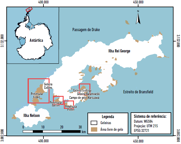 Figura 1: Localização da Ilha Rei George, Antártica e áreas livres de gelo mapeadas.