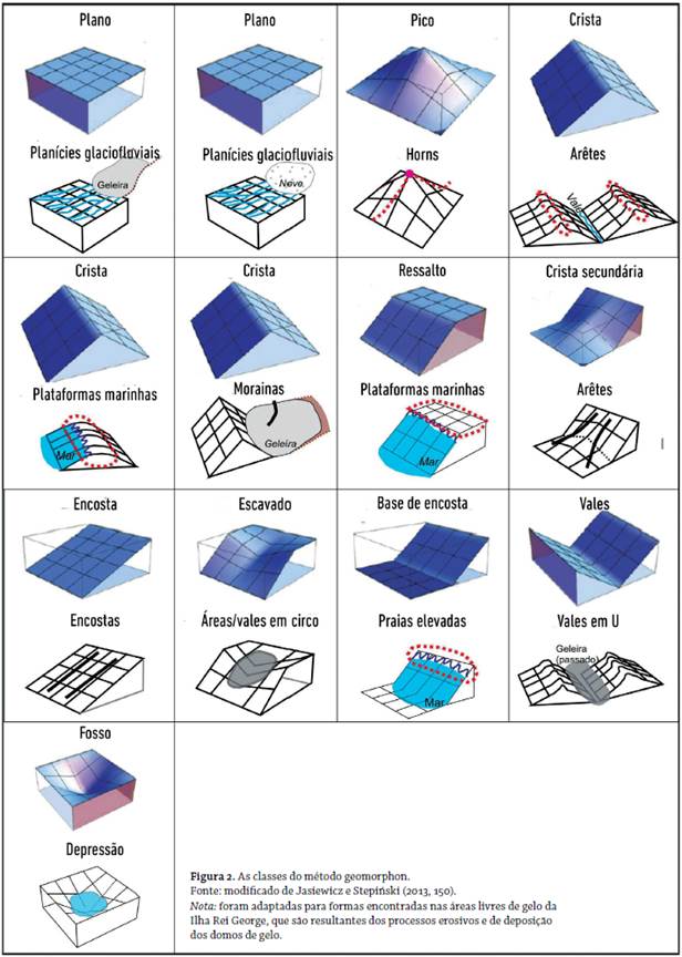 A metodologia utilizada na classificação de geomo-porphon foi baseada em Jasiewicz e Stepinski (2013). Os autores utilizaram a similaridade textural do MDE que apresentou a variação de níveis de cinza em relação às células vizinhas. Para este cálculo, os perfis são definidos para as direções principais da célula central look up distance L extraída do MDE. Foram utilizados dois MDE: TanDEM-X e REMA 8. Ressalta-se que o processamento do MDE foi realizado no http://sil.uc.edu/geom/app. As formas de relevo classificadas são (Figura 2): plano (fiat), pico (peak), crista (ridge), ressaltos (shoulder), crista secundária (spur), encosta (slope), escavado (hollow), base de encosta (footslope), vales (valley) e fosso (pit). O método de identificação dos geomorphon (Jasiewicz e Stepinski, 2013) foi aplicado para as quatro áreas livres de gelo: nas penínsulas Fildes, Potter, Barton e na área livre de gelo em frente ao campo de gelo Warszawa.