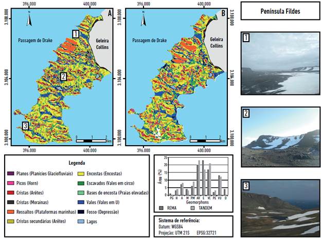 Quanto a caracterização das formas utilizando o método GMA, a forma "planícies glaciofluviais" foi classificada somente no MDE REMA com 1 %; a classe de horns foi representada como sendo 4 % da área para o MDE TanDEM-X e 3 % para o REMA; a forma de arête foi representada com a porcentagem de 8 % e 7 %, respectivamente para os MDE TanDEM-X e REMA; a classe de morainas foi representada com a porcentagem de 3 % e de 4 %; a classe de plataformas marinhas foi identificada com 9 % e 6 % para os dois MDE, respectivamente; a forma de arêtes foi classificada com porcentagem de 23 % e de 20 %; a classe de encostas foram representadas como sendo de 17 % e de 23 % da área; a forma de vales em circo refere-se à 21 % e 17 % da área, para os MDE TanDEM-X e REMA, respectivamente; as praias elevadas foram representadas como sendo de 3 % e de 2 % da área; as formas de vales em u correspondem a 12 % e 13 % da península Fildes; a classe de lagos e alagados foram identificadas somente no MDE REMA com 4 % (Figura 4). As fotografias 1, 2 e 3 (Figura 4) demonstram um vale em u, área de escavado e um vale em u com arête, respectivamente.