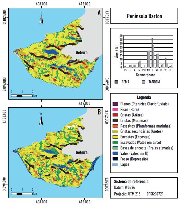 A península Barton apresenta altitude entre 0 m e 260 m, sendo os pontos mais altos próximos à geleira. A declividade predominante ocorre entre 0 % y 20 %, chegando a pontos de 75 %. A classe de planícies glaciofluviais corresponde a 1 % utilizando o GMA para o MDE REMA. O MDE TanDEM-X não identificou essa feição; a classe de horns foi identificada com 3 % e 2 % da área com os MDE TanDEM-x e REMA, respectivamente; para a feição de arêtes a porcentagem identificada foi de 3 % e de 2 %; as morainas foram representadas com 8 % e 6 % da área; a classe de plataformas marinhas corresponde a 2 % na classificação utilizando o MDE TanDEM-x. O MDE REMA não identificou essa feição; os arêtes correspondem a 21 % e 20 % da área; para a forma de encostas a porcentagem mapeada foi de 28 % e de 37 %; a classe de vales em circo corresponde a 17 % e 16 % da península Barton; a forma de praias elevadas corresponde a 4 % e 3 % da área; os vales em u ocupam 5 % e 12 % da área, respectivamente para a classificação com os MDES TanDEM-X e REMA, respectivamente; os lagos e alagados foram identificados como sendo 3 % e 1 % da área (Figura 5).