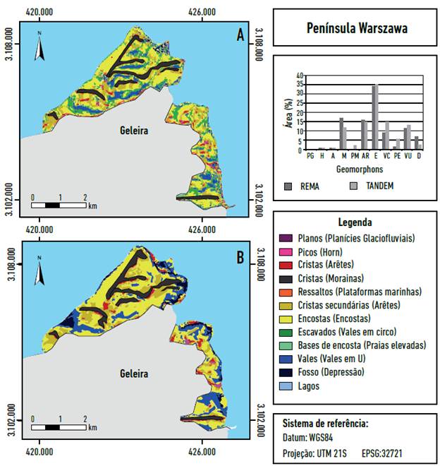 Figura 6: A demonstra o mapeamento de formas utilizando o MDE TANDEM na Península Warszawa; В indica o mapa de formas de relevo com o MDE REMA.