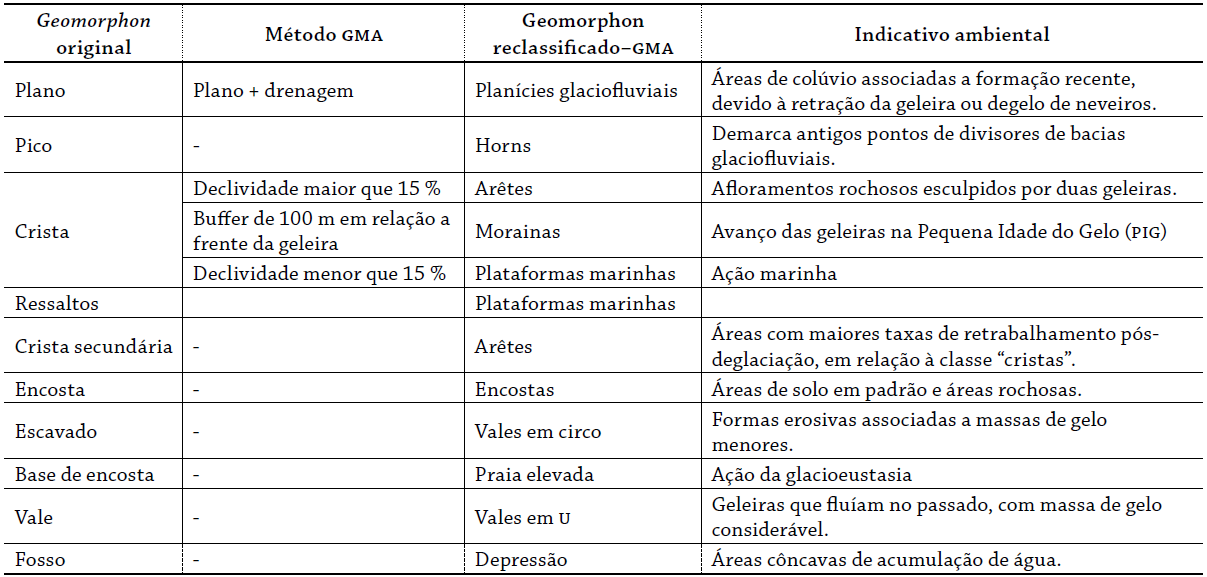 Os elementos de relevo identificados pela metodologia de geomorphon foram relacionados com as formas erosivas e deposicionais de macro escala de gênese glacial como vales, aretês, horns, e de meso escala como canais glaciofluviais, morainas de avanço e de recessão (Tabela 2), e ainda as de gênese paraglacial (encosta ou tálus) e marinha.