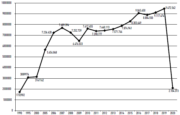 Figura 2: Evolución del número de turistas internacionales en Barcelona (1990-2020).