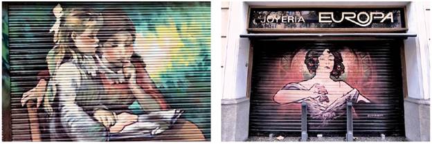 Figura 3: La lectura de Pierre-Auguste Renoir en Kids&Us, School of English (Izq.); Rubi de Alfons Mucha en la Joyeria Europa (Der.).