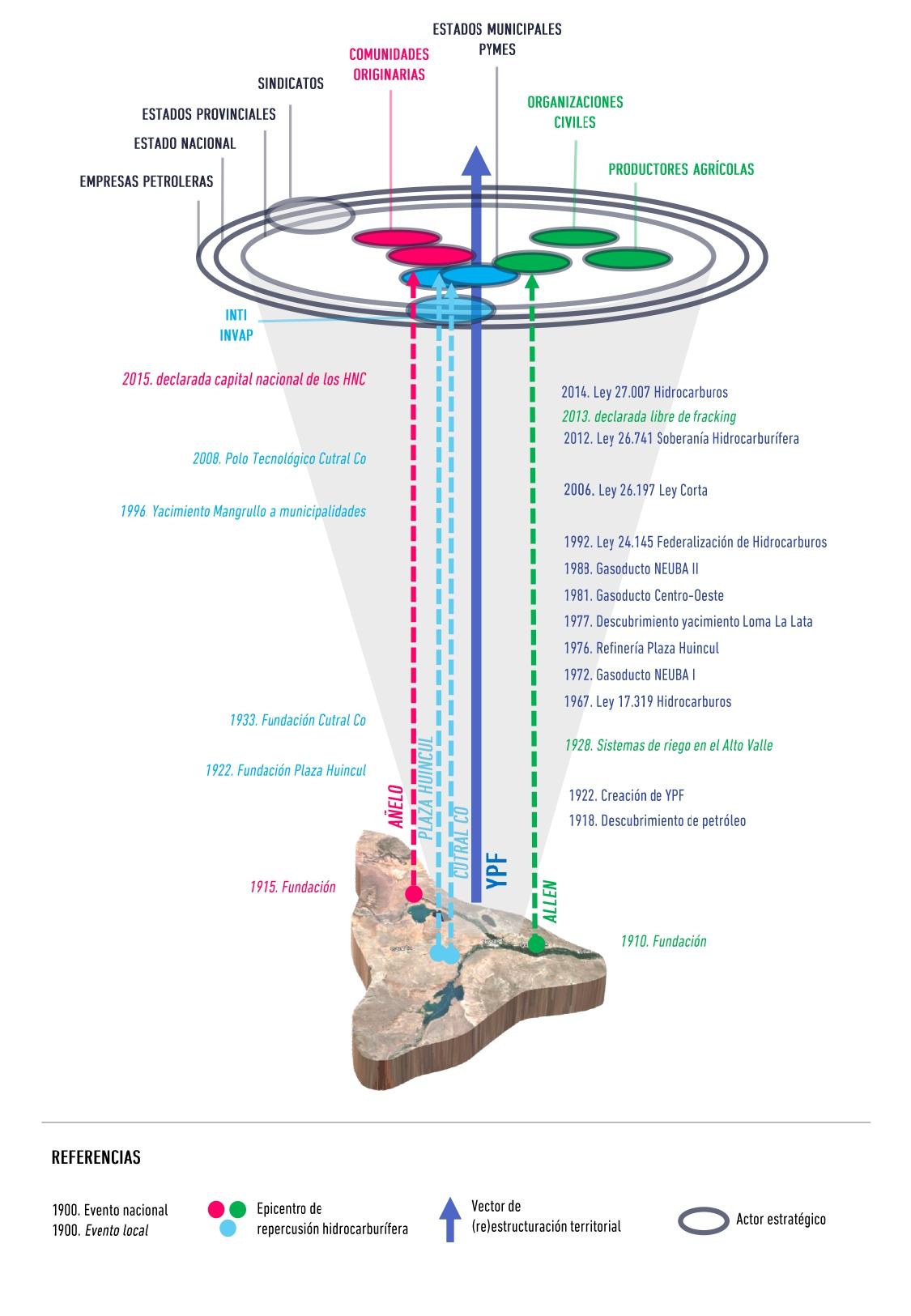 El trabajo indaga acerca de los cambios en las redes y los territorios, asociados a la explotación de los hidrocarburos no convencionales, en el Norte de la Patagonia argentina. Esta actividad, liderada por YPF, ha constituido un vector de (re)estructuración territorial (Figura 2). El estudio se focalizó en las transformaciones territoriales en las localidades de Cutral Co, Plaza Huincul y Añelo en la Provincia de Neuquén, y Allen en la de Río Negro, epicentros de los cambios generados por la explotación hidrocarburífera no convencional, en la formación Vaca Muerta. Se trata de espacios relativamente distantes y diferentes, histórica y geográficamente. Ellos permiten visualizar los impactos de las actividades y las trayectorias territoriales. Estas se asocian no solo a las posibilidades de los lugares, sino también a los caminos tomados por los distintos actores, en cada una. A lo largo del tiempo, interactúan de forma multiescalar, actores internacionales como empresas petroleras; nacionales y provinciales como las administraciones públicas y los sindicatos; y actores locales como municipios, productores frutícolas, comunidades originarias, emprendedores y pymes.