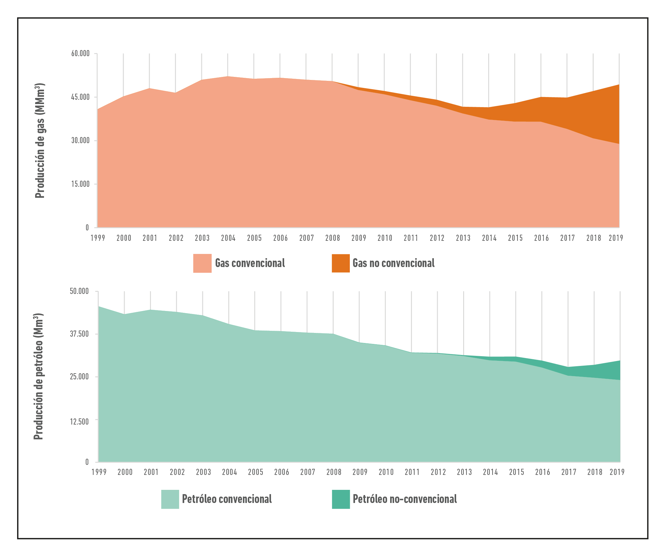 Las actividades se concentran en la formación Vaca Muerta, que aloja las mayores cantidades de recursos. Para 2018, cinco áreas 9 se encontraban en etapa de desarrollo, operadas por las empresas argentinas YPF y Tecpetrol y la francesa Total (véase figura 5). Más de una decena de empresas se suman, con proyectos en etapa de exploración o piloto. El avance de las actividades se refleja en los aumentos de la producción de gas no convencional, que se incrementó de 1.135.521 mm3 en 2010 a 21.242.223 mm3 en 2021. Esto representa el 46 % de la producción gasífera nacional. La producción de petróleo no convencional pasó de 50.091 m3 en 2010 a 7.746.693 m3 en 2021. Esto equivale al 31 % de la producción petrolífera nacional (Figura 6) (Secretaría de Energía 2020).