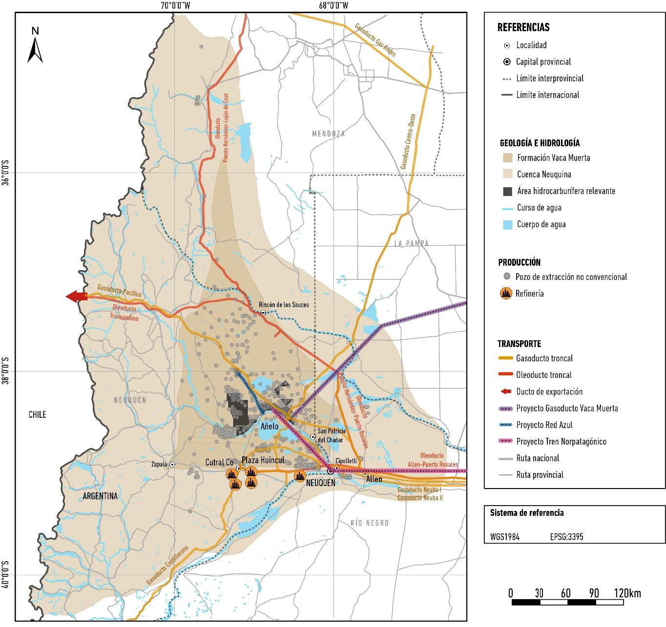 La cuenca Neuquina, una de las cinco cuencas hidrocarburíferas en explotación en Argentina, se convierte en nodo del desarrollo hidrocarburífero no convencional, a nivel nacional e internacional. Ubicada mayoritariamente en la provincia de Neuquén, allí se refuerzan las redes que involucran: i) actores que se reposicionan y asocian en pro de sus intereses; ii) infraestructuras que son extendidas para fortalecer las conexiones y iii) flujos dinamizados, en función de posibilidades e intereses variados. Para la integración territorial, el Estado asume un rol protagónico en la promoción de la actividad y la regulación del sector. Las empresas operadoras responden proyectando y ejecutando inversiones en la explotación de los recursos. Se inician mejoras y se impulsan proyectos de infraestructuras industriales y de transporte para posibilitar la valorización de los recursos y circulación de los flujos.