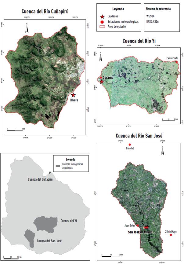 Uruguay se encuentra en el bioma Pampa, en la zona baja de la cuenca del río de la Plata, su ubicación geográfica es 30°-35° de latitud sur y de 56°-58° de longitud oeste. El clima es templado subtropical y no presenta una estación lluviosa, ya que el promedio de las precipitaciones se distribuye a lo largo del año (Achkar et ál. 2016). En la Figura 1 se presentan los tres casos de estudio: la ciudad de San José de Mayo en el sur del país, con la cuenca del río San José; la ciudad de Durazno en el centro del país y la cuenca del río Yi; y la ciudad de Rivera en el norte del país con la cuenca del Cuñapirú. Los criterios tomados en cuenta para la selección de los casos de estudio fueron: el patrón espacial de las localidades en áreas de humedales, la presencia de eventos de inundación, la ubicación de por lo menos el 45 % de las secciones censales urbanas en humedales y la cantidad de inundaciones registradas por el Sistema Nacional de Emergencias de Presidencia de la República -en adelante, SINAE- (Schön, Domínguez y Achkar 2018; Schön 2021).