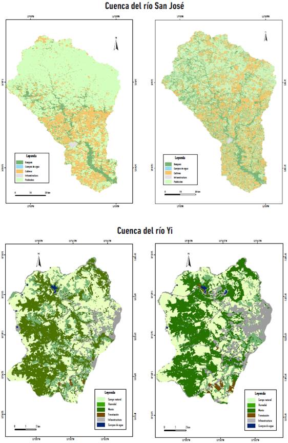 En las cuencas hidrográficas se analizó el uso de suelo a escala 1:30.000, ampliando el nivel de detalle en las zonas urbanas a escala 1:10.000. Se realizaron clasificaciones supervisadas de las imágenes satelitales por medio del método de distancias mínimas para cada una de las cuencas, y se consideraron entre cinco y seis clases dependiendo de la característica específica de cada cuenca. Estas representan en todas las cuencas la categoría del Campo natural que es la clase más genérica, ya que está conformada por pastizales de diferente productividad. Por su parte, la clase Infraestructura incluyó zonas industriales, residenciales y de caminería. En las cuencas del San José y del Yi, en la categoría de Cultivos se incluyeron parcelas de praderas plantadas con fines forrajeros, puesto que sustituyen por completo la cobertura vegetal y presentan una firma espectral similar a los cultivos; también se incluyeron zonas de suelo descubierto, debido a que estas superficies se encuentran asociadas a unidades agrícolas. Por la ausencia de cultivos en la cabecera de la cuenca del Cuñapirú, para esta área no se aplicó esta categoría. Después, se estableció la categoría de Monte nativo/Bosque que en su mayoría está representada por bosques ribereños, pero en el caso de la cuenca del San José incluye de igual forma los cultivos forestales, porque no se encuentran grandes superficies forestadas. En las otras dos cuencas se generó la categoría Cultivo forestal en la cual se unen los montes de abrigo y las grandes superficies forestadas de la industria forestal. Además, se trabajó con la categoría de Cuerpos de agua en la cuenca del San José y en la del Cuñapirú; y por último, la categoría de Humedales en la cuenca del Cuñapirú y del Yi, que representa áreas bajas que no están cubiertas por árboles y que se diferencian del campo natural por permanecer inundadas en forma permanente o la mayor parte del año.