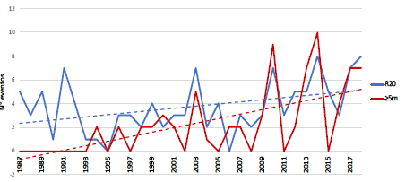 También en la cuenca del Yi, en la ciudad de Durazno se muestra en el análisis de la serie de las precipitaciones un resultado estadísticamente significativo de tendencia creciente en invierno entre 1987 y 2018. Pero en la zona de las nacientes, representada por la serie de precipitaciones de Cerro Chato, no se encuentran tendencias de aumento en las precipitaciones por el test de Mann-Kendall. En la serie de precipitaciones diarias mayores a 20 mm (R20) en Durazno se encuentra una tendencia de incremento durante el invierno (Figura 5).
