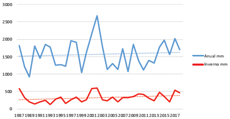 El análisis de las series de precipitaciones realizado a partir de la sumatoria estacional de precipitaciones acumuladas arrojó resultados estadísticamente significativos o parcialmente significativo de tendencia creciente en invierno para las tres estaciones de la cuenca del San José entre 1987 y 2018. En los eventos de precipitaciones fuertes mayores a 20 mm (R20), se ve en las tres series de la cuenca una tendencia de aumento durante el invierno en la Figura 3 se muestra la situación de Juan Soler como ejemplo para la cuenca del río San José.