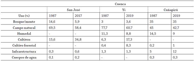 Las tres cuencas muestran un comportamiento totalmente distinto de su cambio en el uso de suelo. La cuenca del San José se ha transformado en una cuenca casi completamente ocupada por agricultura. La cuenca del Yi tiene una presencia importante de la agricultura, pero también un porcentaje significativo de la superficie que se dedica al Cultivo forestal. En cambio, la cabecera de cuenca del Cuñapirú no ha pasado por el mismo proceso, ya que la transformación más significativa que se registra es el aumento en el suelo urbano, pero en las tres cuencas los cambios en el uso del suelo repercuten en la disminución de la infiltración y el aumento del escurrimiento superficial del agua de las precipitaciones. Procesos que colaboran en que las tres ciudades registran un incremento de los eventos de inundaciones importantes, que han afectado a la población.