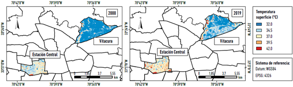 Como consecuencia de lo anterior, la distribución y magnitud de las temperaturas superficiales son, igualmente, muy distintas entre las comunas de Estación Central y Vitacura. La primera tuvo un promedio más cálido de 4 °C que la segunda, tanto en el 2000 como en 2019. Sin embargo, las dos comunas registraron un incremento de temperatura que se puede estimar como de 1 °C cada cinco años (Figura 6), con una distribución interna altamente fragmentada en función de los usos y coberturas de suelos.