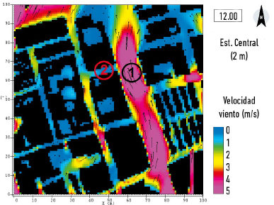 Al analizar el comportamiento del viento en Estación Central, se advierte que su velocidad es muy baja y de dirección variable encauzado por las edificaciones y sometido al efecto de rugosidad causado por las construcciones de altura. A nivel peatonal (2 m), la mayor parte de las calles registró velocidades inferiores a 1 m/s, creando las denominadas "zonas muertas" (Aristodemou et ál. 2018), por su ausencia de ventilación; mientras la autopista que la cruza, por ser más ancha y paralela a la dirección del viento predominante de rumbo sur, alcanzó mayores valores (Figura 7). Esta débil velocidad del viento prácticamente no experimenta cambios en la simulación durante el día. La Figura 8 ilustra dos puntos, con diferentes comportamientos: en 1, se trata de una calle ancha (autopista), orientada en favor de la dirección del viento, y en 2, por el contrario, de una calle estrecha, perpendicular al viento sur.