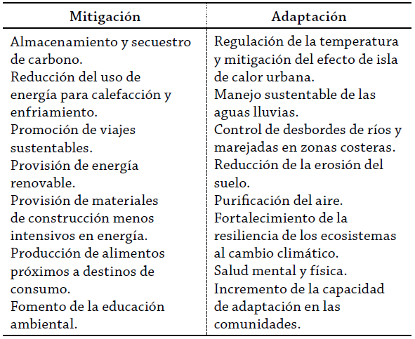 La planificación e implementación de sistemas de infraestructura verde en múltiples escalas ha sido reconocida como una estrategia efectiva para enfrentar la emergencia climática, la cual incluye desde la construcción de espacios verdes urbanos altamente intensivos en uso de tecnología, como las fachadas verdes, hasta la protección de ecosistemas como bosques y humedales (Kazmierczak y Carter 2010; EPA 2016; Samora-Arvela et ál. 2017). En este sentido, la infraestructura verde es una estrategia territorial que ayuda a enfrentar la emergencia climática de diversas formas, pero en la literatura destacan dos: el aumento de los niveles de resiliencia de las ciudades; y la provisión de servicios ecosistémicos que permiten enfrentar la emergencia climática (Gill et ál. 2007; Vásquez 2016). Los servicios ecosistémicos son aquellos servicios de los ecosistemas que benefician a los seres humanos y contribuyen a su bienestar (Potschin et ál. 2016). Muchos de los servicios ecosistémicos provistos por la infraestructura verde tienen un rol clave para enfrentar la emergencia climática, no solo para la adaptación, sino que también para la mitigación (Tabla 2).