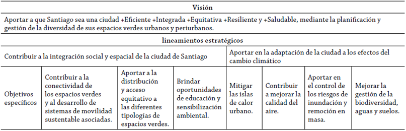 A partir de la revisión de planes de infraestructura verde internacionales, las discusiones sostenidas en los talleres y la revisión de iniciativas nacionales, el equipo de la Universidad de Chile reconoció 7 objetivos específicos, los cuales fueron agrupados en dos grandes lineamientos estratégicos, como se puede apreciar en la Tabla 4.