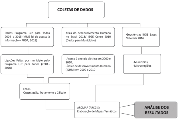 A fim de alcançar os objetivos, a metodologia utilizada envolveu uma revisão bibliográfica semi-sistemática sobre o assunto "justiça energética" a partir das bases de periódicos como Scielo, ProQuest, Periódicos Capes, entre outros. Os dados a respeito do acesso à energia elétrica foram recuperados a partir da base Atlas Brasil, do Programa das Nações Unidas para o Desenvolvimento (PNUD -Brasil) (PNUD 2013), enquanto os dados relacionados ao PLpT foram adquiridos junto ao Ministério de Minas e Energia (MME) (PBDA 2018), por meio do recurso à Lei de Acesso (BRASIL 2011). Por fim, a espacialização dos dados foi realizada com o uso do software ArcGIS 10.3 (ESRI 2014). A Figura 1 apresenta a síntese da metodologia empregada nesse trabalho.