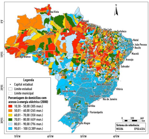 Figura 2: Acesso à energia elétrica no Brasil em 2000: espacialização do número de domicílios com acesso à energia elétrica.
