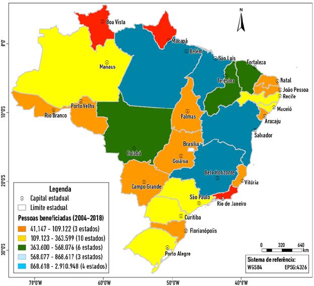 Considerando o número de pessoas beneficiadas pelo PLpT desde o seu início até o ano 2018 (Figura 5), observa-se que em todos os estados do Brasil houve atuação deste programa. Sendo que a maioria desses estados eram das regiões norte e nordeste, incluindo moradores que vivem em áreas isoladas e reservas extrativistas. A Bahia é o estado com o maior número de pessoas beneficiadas, com 2.910.948, cerca de 20 % da população do estado15; seguido do Pará, com 1.994.438 (26 % da população do estado); do Maranhão, com 1.686.974 (25 % da população do estado); e de Minas Gerais, com 1.595.532 (8 % da população do estado), cujos munícipios mais beneficiados estão ao norte do estado e fazem parte do semiárido brasileiro16.