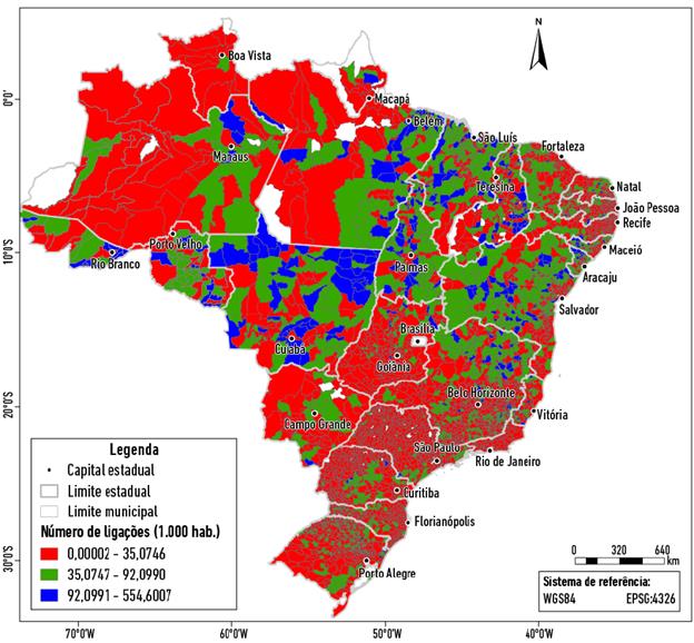 Em termos relativos, analisam-se os números de ligações do programa e normalizados pelo tamanho da população do município (número de ligações por mil habitantes) no período 2004-2010 (Figura 6). Por meio dessa estratégia, podem ser avaliados os municípios que mais receberam ligações em função ao tamanho da população.